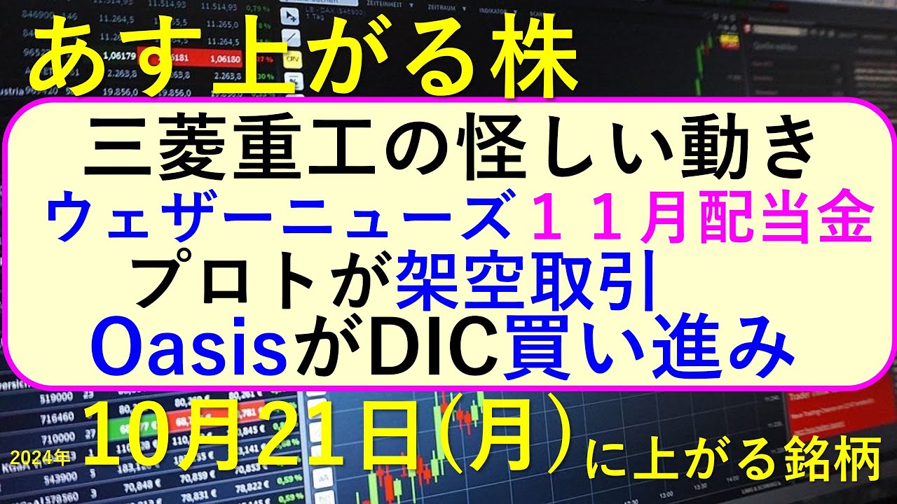 今日の引け後に出た材料で、週明け10/21(月)に期待できる銘柄。三菱重工が怪しい動き。OasisがDICを買い進み。プロトが架空取引で決算延期。ウェザーニューズの11月配当金~あす上がる株。最新の日本株情報。高配当株の株価やデイトレ情報についてもお話しいたします。