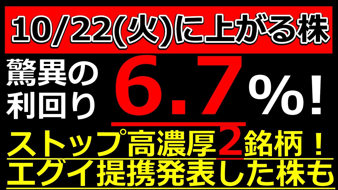 ストップ高濃厚2銘柄!エグイ提携発表きた!驚異の利回り6.7%ヤバイ!【10/22(火)に株価が上がる株・明日上がる株・株式投資日本株最新情報】