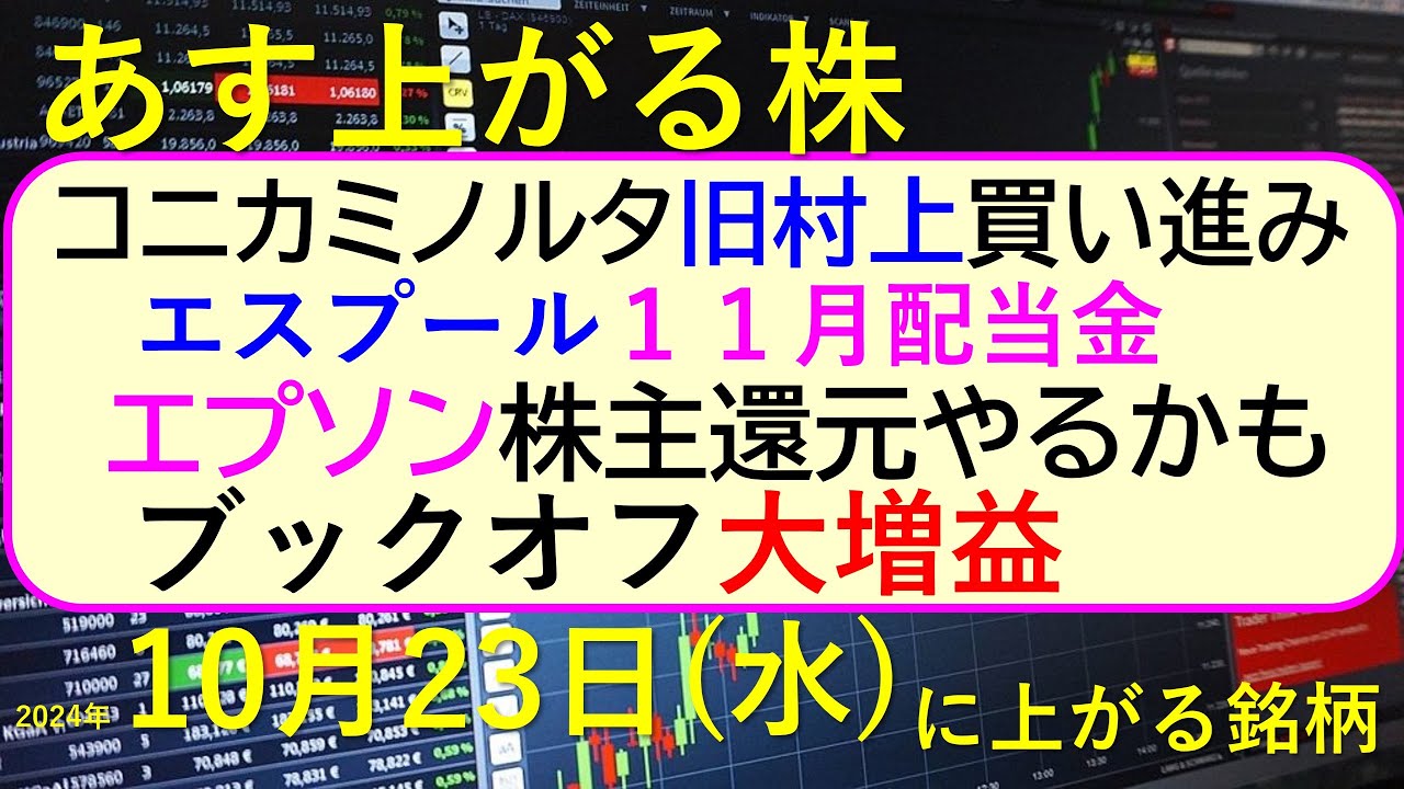 今日の引け後に出た材料で、明日10/23(水)に期待できる銘柄。コニカミノルタを旧村上が買い進み。ブックオフが大増益。エプソンが株主還元をやるかもしれない。エスプールの11月配当金。~あす上がる株。最新の日本株情報。高配当株の株価やデイトレ情報についてもお話しいたします。