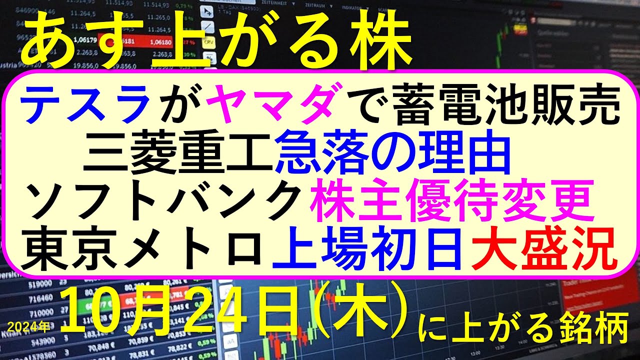 あす上がる株 2024年10月24日(木)に上がる銘柄。テスラがヤマダで蓄電池販売。三菱重工急落の理由。ソフトバンク株主優待変更。東京メトロ上場~最新の日本株情報。高配当株の株価やデイトレ情報も~