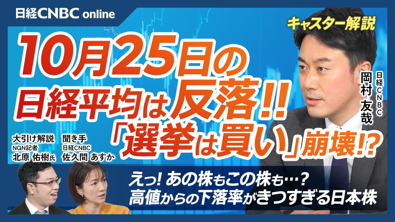 【10月25日(金)東京株式市場】日経平均株価は反落、自公過半数割れ警戒で「選挙は買い」崩れる/高値からの下落率がきつい日本株・時価総額と信用買い残で確認…大型株、半導体株、住信SBI銀や名村造船も⇩