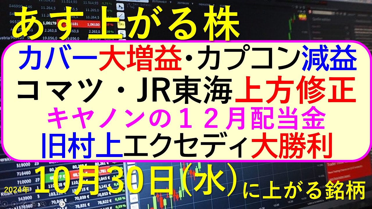 今日の引け後に出た材料で、明日10/30(水)に期待できる銘柄。カバー大増益、カプコン減益。コマツとJR東海が上方修正。旧村上がエクセディで大勝利。キヤノンの12月配当金~あす上がる株。最新の日本株情報。高配当株の株価やデイトレ情報についてもお話しいたします。