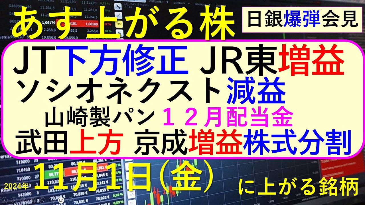 今日の引け後に出た材料で、明日11/1(金)に期待できる銘柄。JTが下方修正、JR東は増益、ソシオネクストは減益、武田薬品上方修正、京成電鉄が増益と株式分割~あす上がる株。最新の日本株情報。高配当株の株価やデイトレ情報についてもお話しいたします。
