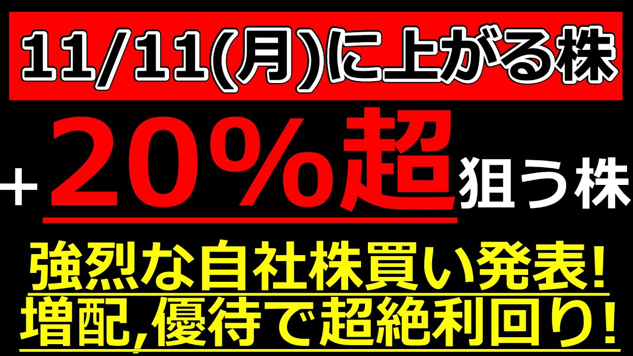 +20%超狙える株!強烈な自社株買い発表!増配,優待で超絶利回り!【11/11(月)に株価が上がる株・明日上がる株・株式投資日本株最新情報】