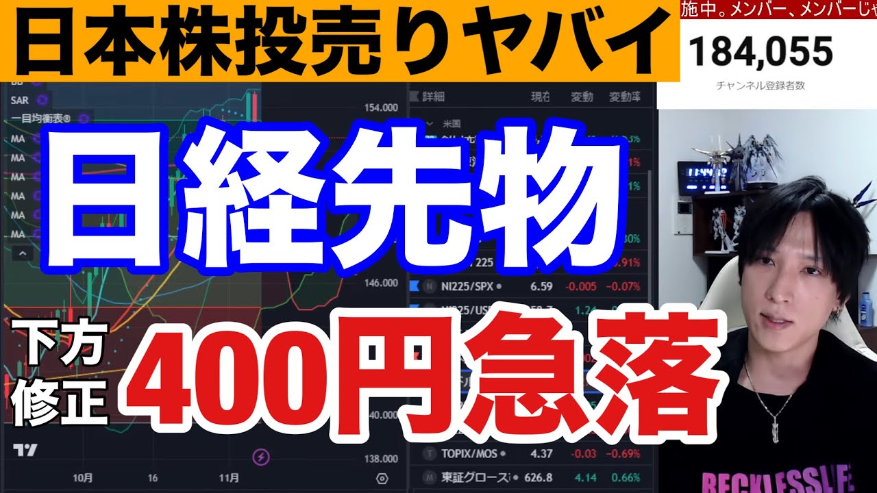 11/9、【日本株投げ売りヤバい】米国株強いのに日経先物下方修正で400円急落弱すぎる。ドル円152円に下落で自動車株急落。ナスダック、半導体株どうなる。仮想通貨BTC強い。