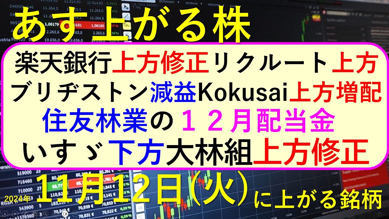 今日の引け後に出た材料で、週明け11/11(火)に期待できる銘柄。楽天銀行、リクルート、ブリヂストン、KokusaiElectric、いすゞ、大林組の決算と株価推移。住友林業の12月配当金。~あす上がる株。最新の日本株情報。高配当株の株価やデイトレ情報についてもお話しいたします。