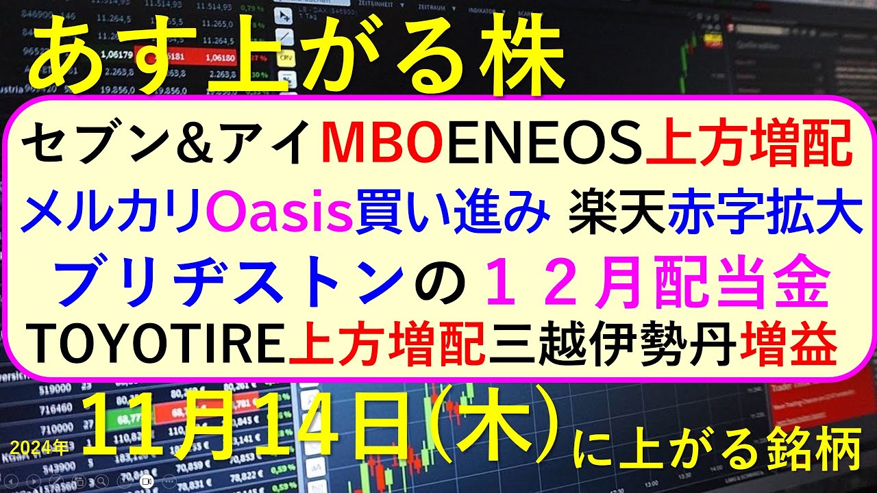 今日の引け後に出た材料で、明日11/14(木)に期待できる銘柄。セブン&アイがMBO。メルカリをOasisが買い進み。ENEOS、楽天、TOYOTIRE、三越伊勢丹の決算。ブリヂストンの12月配当金~あす上がる株。最新の日本株情報。高配当株の株価やデイトレ情報についてもお話しいたします。
