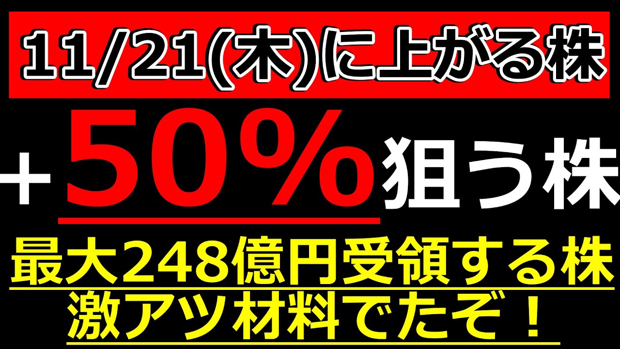 +50%狙える株!激アツ材料でたぞ!最大248億円受領する株!【11/21(木)に株価が上がる株・明日上がる株・株式投資日本株最新情報】