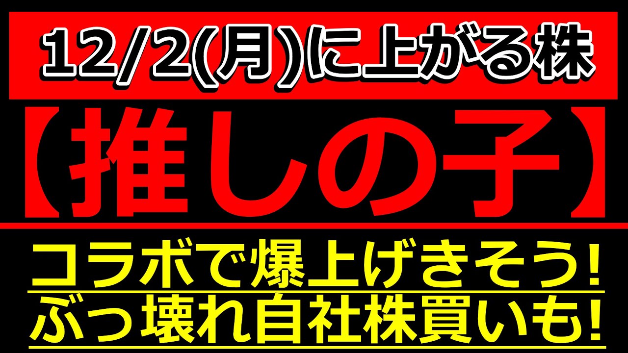 【推しの子】コラボで爆上げしそうな株!ぶっ壊れ自社株買い発表した株も!【12/2(月)に株価が上がる株・明日上がる株・株式投資日本株最新情報】