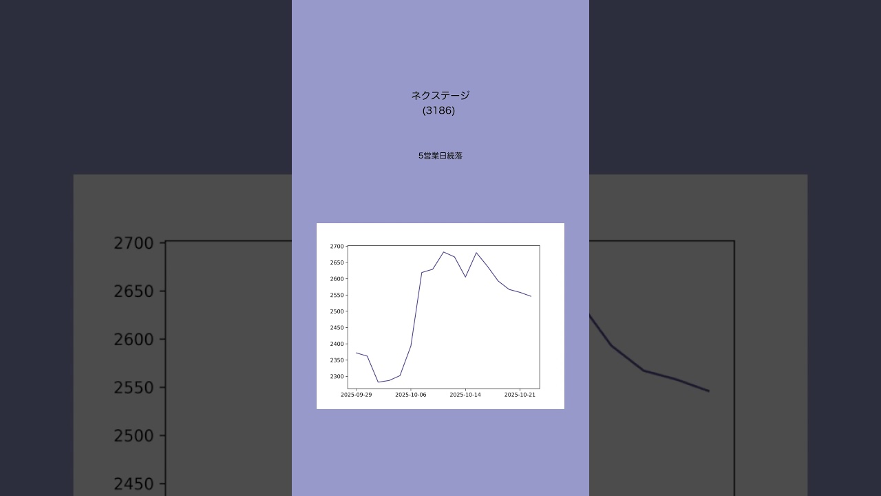 続落中の注目銘柄(10月22日編) 注目銘柄 X 2025.10.23 十分な調査を行っておりますが複数人での確認等は行っておらず誤りが含まれる可能性がございます。 気になる点があれば他の株サイト等も確認をお願いします。また、投資は自己責任でお願いします。 VOICEVOX:雨晴はう