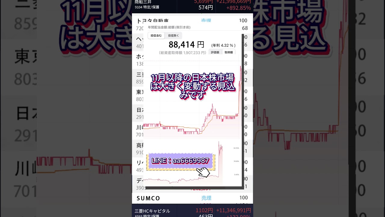 アメリカの利下げにより11月から日本株は大きく動く見込みです。手を出すべきでない銘柄も存在。富士通を1,950円で買い14,600円で売却した成功例を紹介。現在のターゲット株は株価465円、目標9,950円。LINEで「2025」と送信すれば無料で詳細情報を入手可能。経済的自由を得た私が、本当に使える投資情報を提供します。