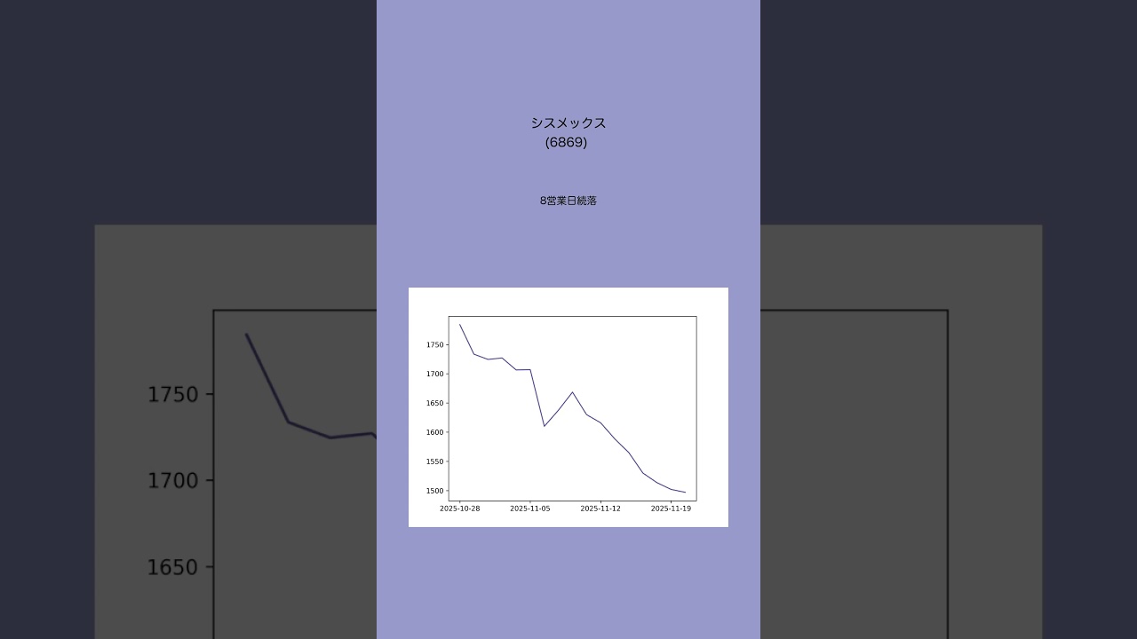 続落中の注目銘柄(11月20日編) 注目銘柄 X 2025.11.21 十分な調査を行っておりますが複数人での確認等は行っておらず誤りが含まれる可能性がございます。 気になる点があれば他の株サイト等も確認をお願いします。また、投資は自己責任でお願いします。 VOICEVOX:雨晴はう