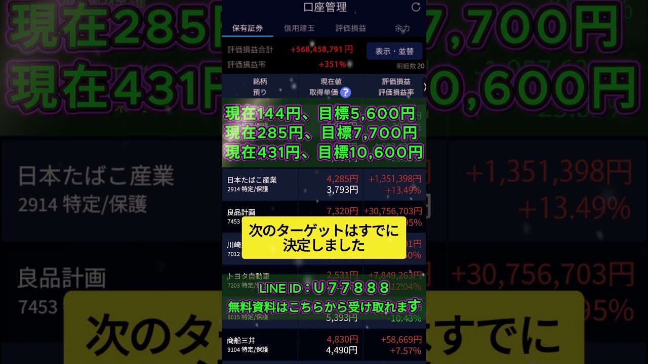 動画で紹介した急騰中の優良銘柄に興味がある方には、無料でレポートをお渡しします!検索して追加してください!!「いいね」してくださった方は、プロフィールのリンクから入っていただければ、銘柄コードを受け取れます。