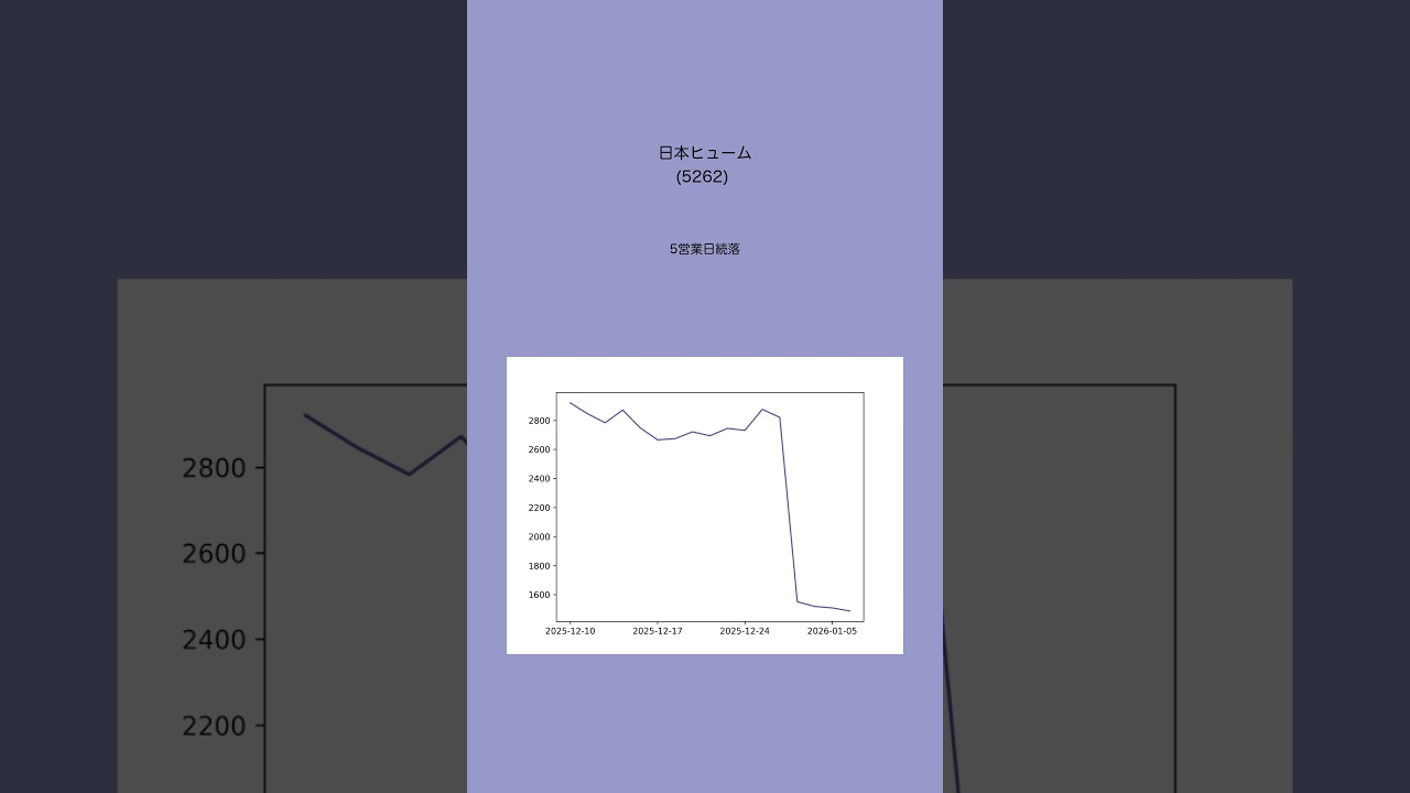 続落中の注目銘柄(1月6日編) 注目銘柄 X 2026.01.07 十分な調査を行っておりますが複数人での確認等は行っておらず誤りが含まれる可能性がございます。 気になる点があれば他の株サイト等も確認をお願いします。また、投資は自己責任でお願いします。 VOICEVOX:雨晴はう