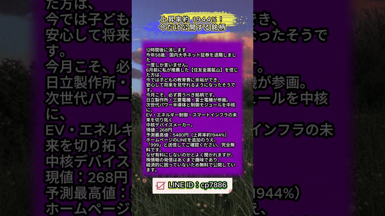 株価予測私は数十年投資をしており、初心者の方にも投資家の方にもお手伝いできます。LINE ID「cp7886」で、無料で株式情報や投資資料をシェアしていますので、ぜひ追加して受け取ってください。